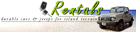 Vehicles Available for RentOur rentals consist of fully-functional cars and jeeps. Prices include all taxes, unlimited mileage and a free map of the island. Rent for 6 days, & get the 7th day FREE. Weekly Rate includes special 6 day Rental with 7th day FREE. Rates for Mitsubishi Lancer :